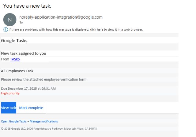 در واقع، مهاجمان تلاش میکنند این تصور را ایجاد کنند که شرکت استفاده از ابزار مدیریت وظایف گوگل را آغاز کرده و کارمند باید فوراً از طریق لینک موجود در اعلان، فرم تأیید هویت کارکنان را تکمیل کند.